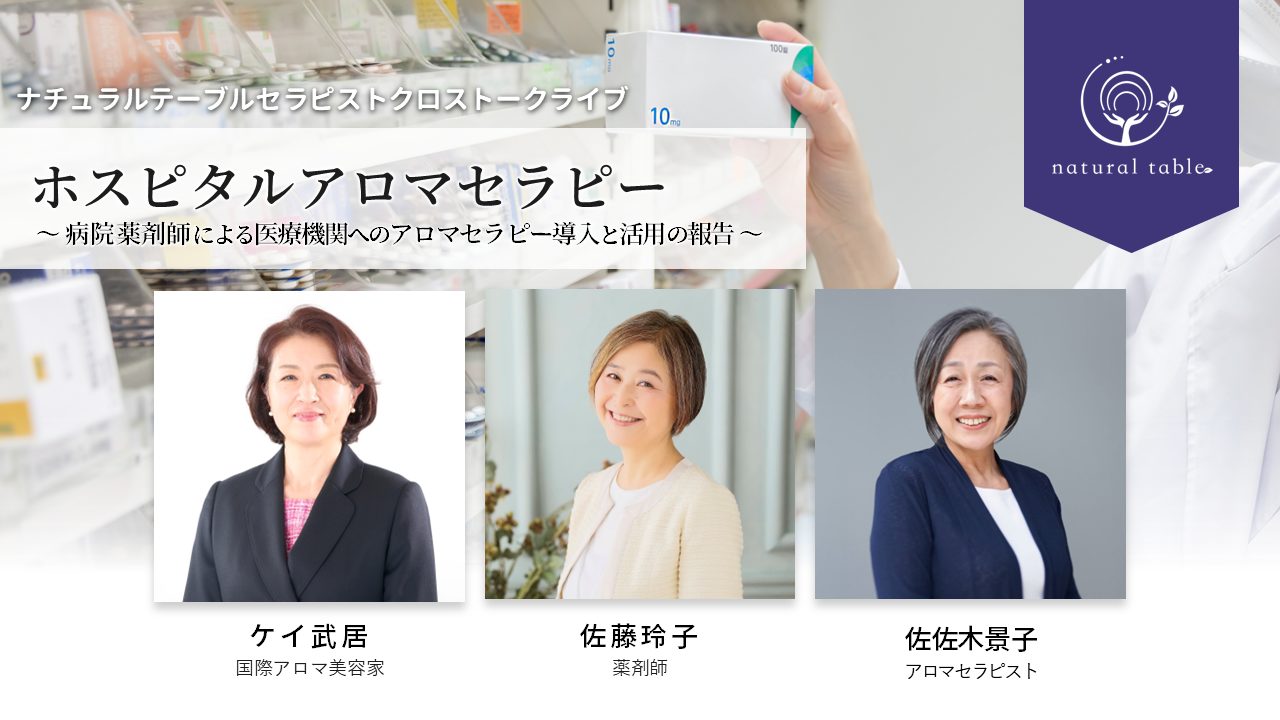 第68回セラピストクロストークライブは、湘南ホスピタルにて院内製剤としてアロマセラピーを導入されている佐藤玲子さんをお招きします。