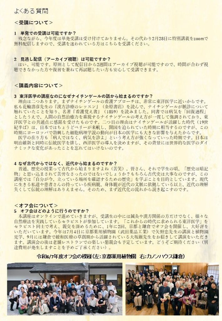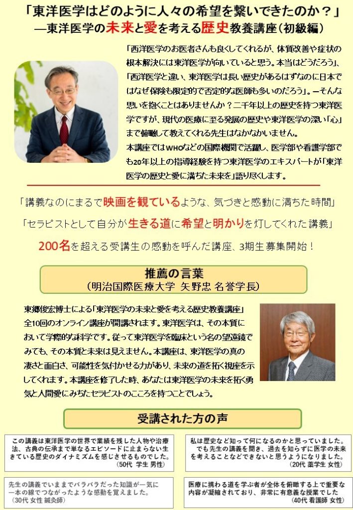 この「東洋医学の未来と愛を考える歴史教養講座」は、WHOやISOなどの国際機関で活動し、医学部や薬学部、看護学部で2000名以上の学生さんを指導してこられた東郷先生が「セラピーの未来を創るあなた」に伴走してくれます。
